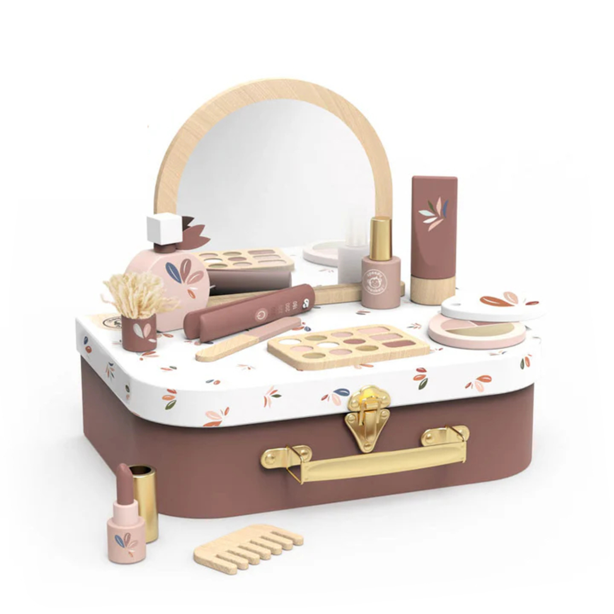 Kofer se otvara i otkriva šarenu kolekciju drvenih kozmetičkih dodataka, savršenih za oponašanje rutina odraslih na zabavan i siguran način.