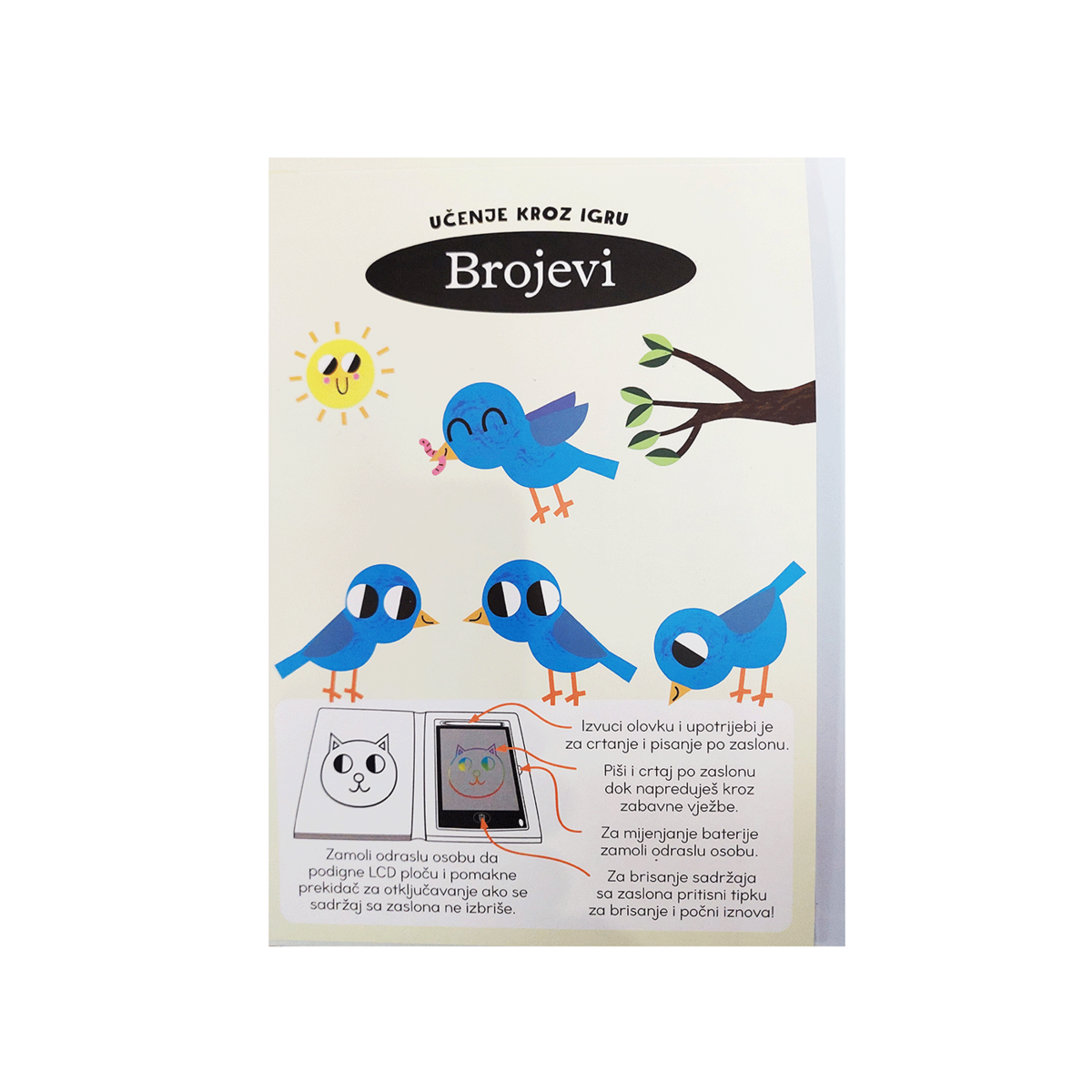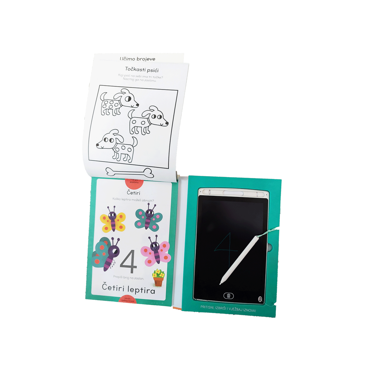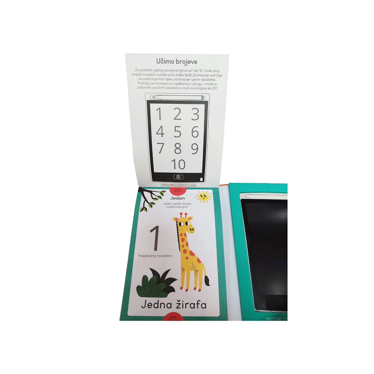 Edukativna slikovnica s LCD pločom za crtanje i pisanje – Brojevi. Uz ovu slikovnicu dolazi i LCD ploča na kojoj vaše dijete može vježbati crtanje i pisanje. S pomoću priložene olovke vaše će dijete crtati i pisati po zaslonu, a potom može pritisnuti tipku za brisanje i krenuti ispočetka.