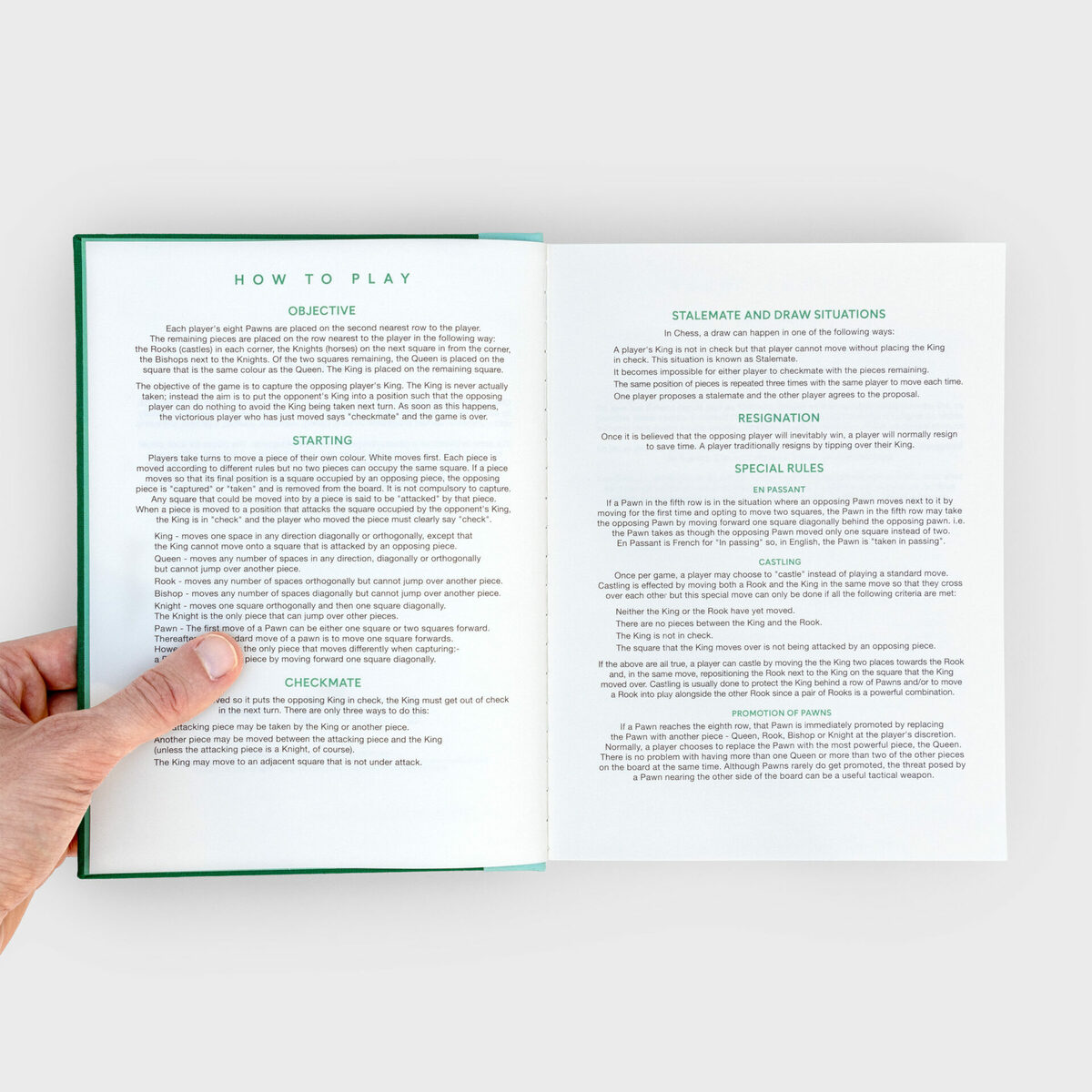 Otvorite tvrdi uvez knjige i pronađite šahovsku ploču i figure skrivene unutar stranica. Knjiga uključuje pravila šaha na četiri jezika i idealna je za pohranu na policu kao ukras i za igru.