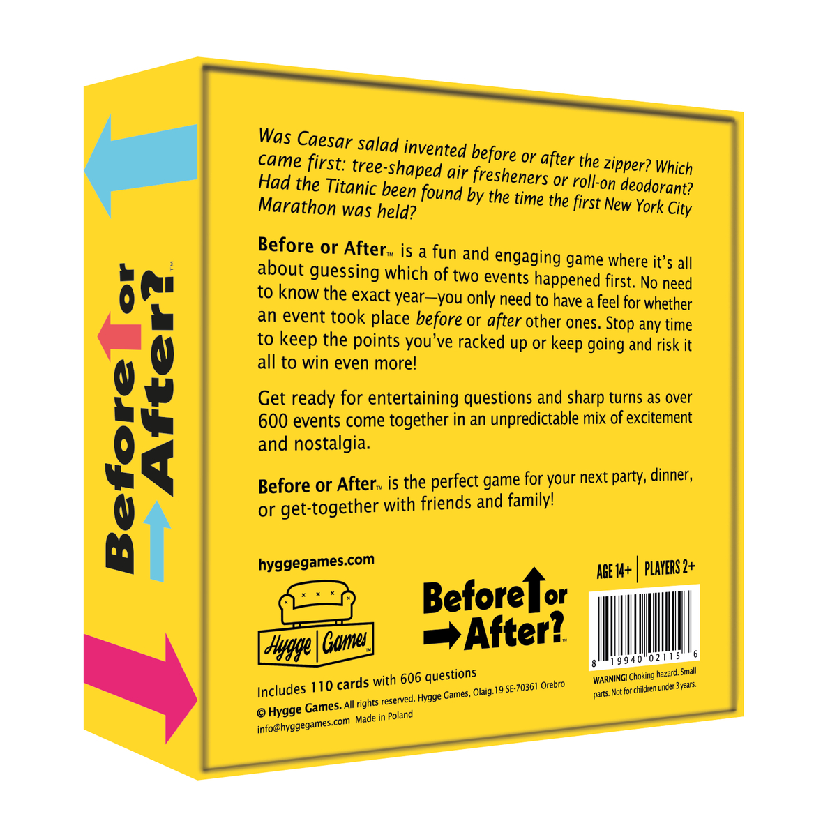 Before or After je zabavna i zanimljiva igra u kojoj se sve svodi na pogađanje koji se od dva događaja dogodio prvi. Nema potrebe znati točnu godinu - samo trebate imati osjećaj je li se neki događaj dogodio prije ili poslije drugih. Zaustavite se bilo kada kako biste sačuvali bodove koje ste sakupili ili nastavite i riskirajte sve kako biste osvojili još više!