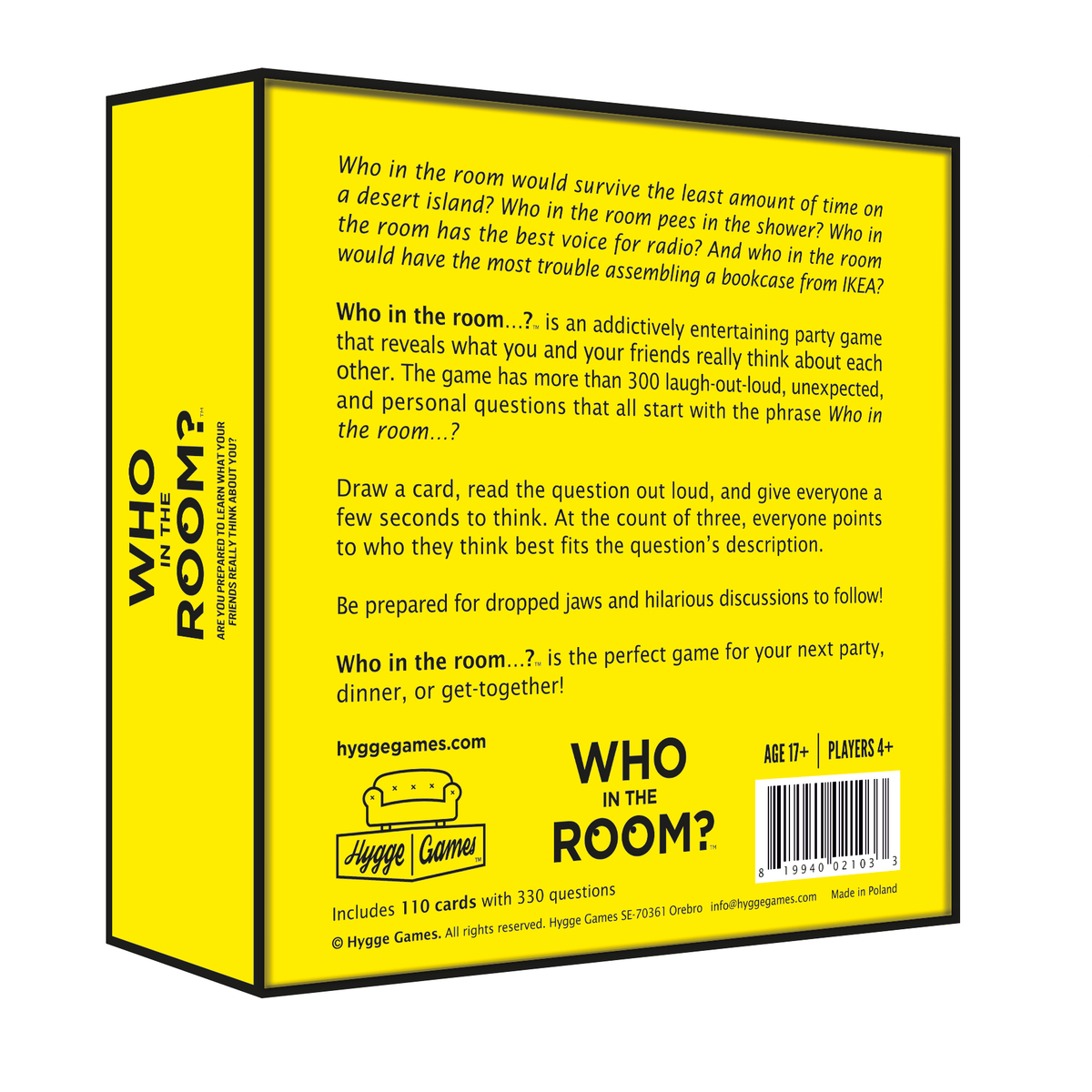 Igra Who in the Room je zarazno zabavna društvena igra koja otkriva što vi i vaši prijatelji stvarno mislite jedni o drugima. Igra ima više od 300 smiješnih, neočekivanih i osobnih pitanja koja sva počinju frazom Tko u sobi...?