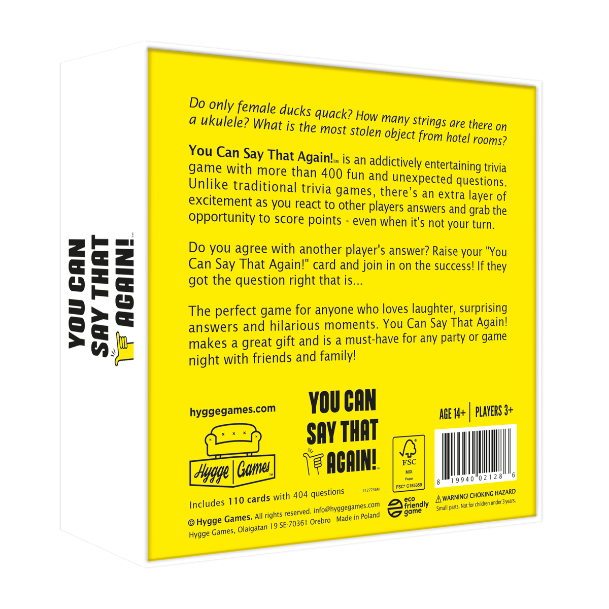 You Can Say That Again je zarazno zabavna kviz igra s više od 400 zabavnih i neočekivanih pitanja.