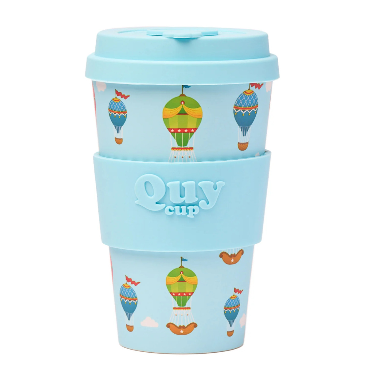 Putna šalica zrađena od recikliranog PET materijala za prehrambenu upotrebu. Sadrži patentirani QuyCup poklopac protiv kapanja i mekanu silikonsku traku protiv opeklina.