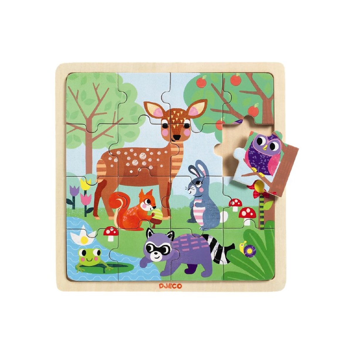 Drvene Djeco puzzle od 16 dijelova s motivom šumskih životinja.