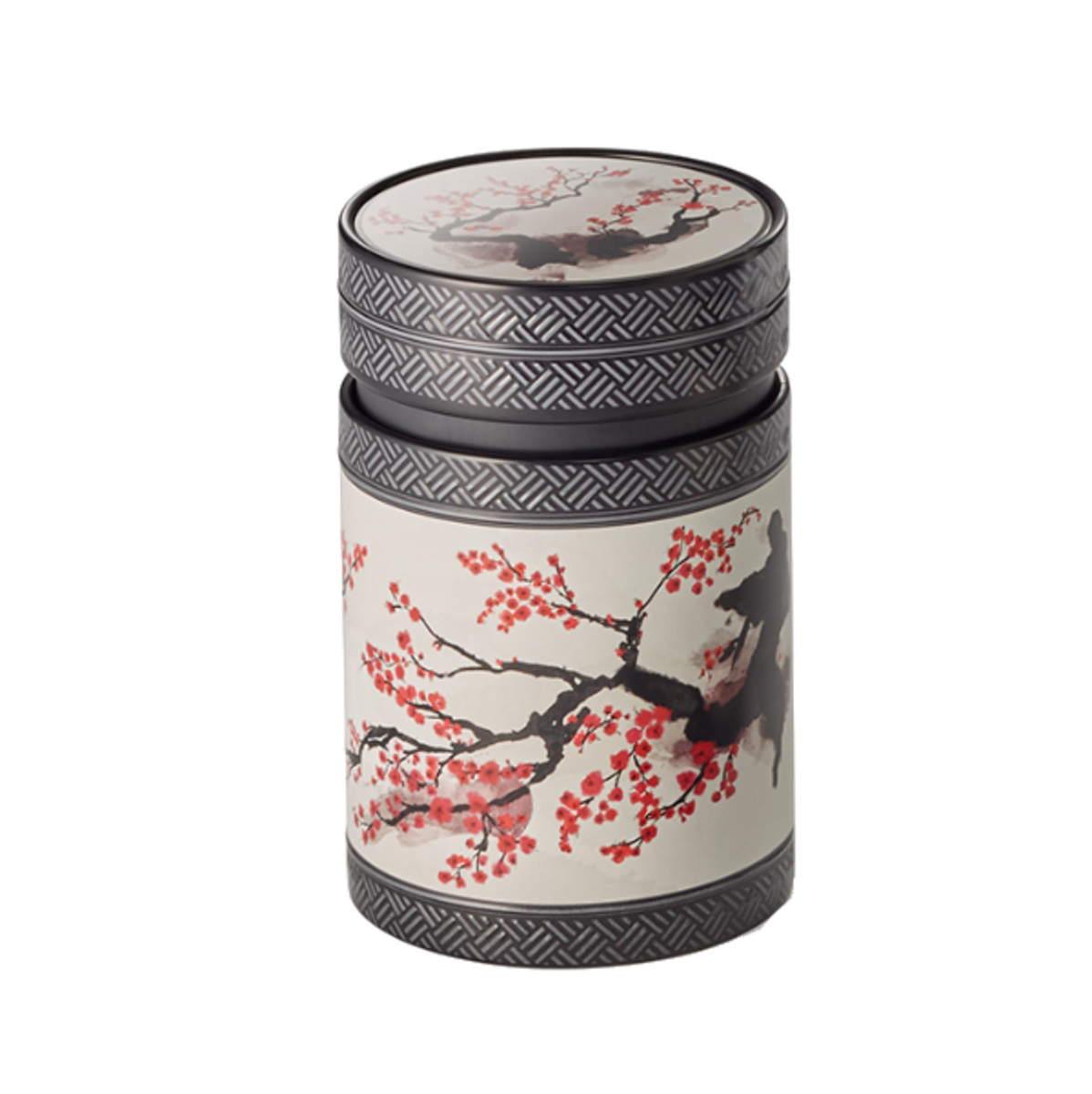 Limeni spremnik za čaj s tradicionalnim dalekoistočnim motivom, trešnjinim cvijetom. Visokokvalitetni poklopac zadržava aromu čaja.