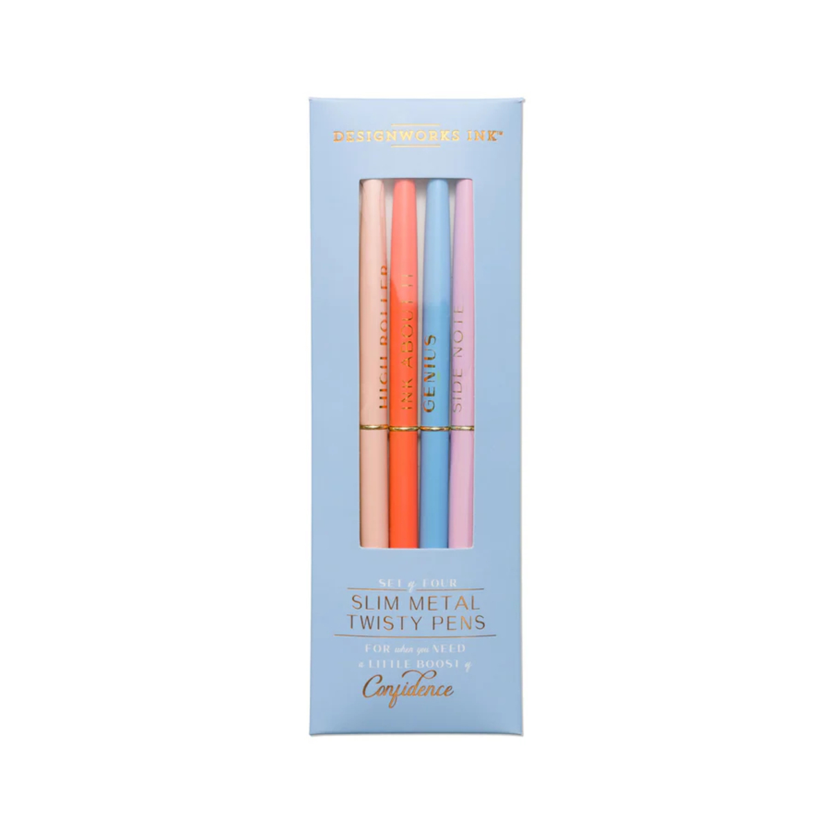 Kemijske olovke Twisty Slim metal - Blue Proizvođač:DesignWorks Ink, SAD Web cijena: 20,80 € Dodaj Set od 4 tanke metalne kemijske olovke za što lakše pisanje. crna tinta 4 različita natpisa: "Genius", "Ink About It", "High Roller" i "Side Note"