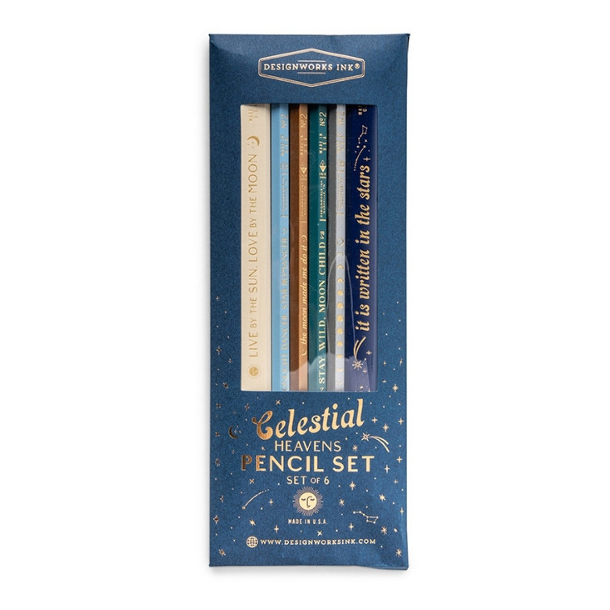 Set olovaka Celestial Heavens Proizvođač:DesignWorks Ink, SAD Web cijena: 13,80 € Dodaj Set od 6 grafitnih olovaka: 4 olovke s gumicom i 2 široke (stolarske) olovke sa zlatnim ugraviranim natpisima.