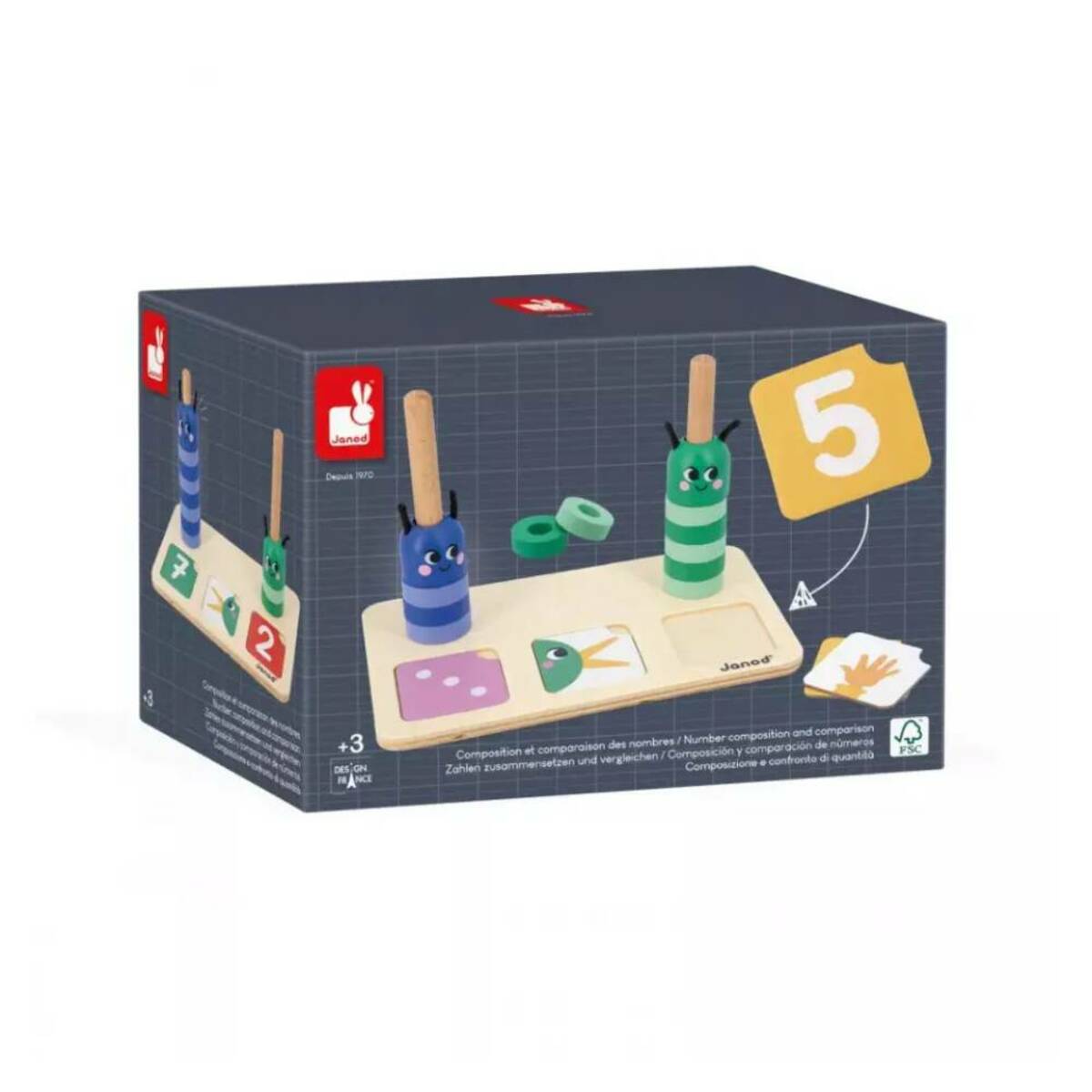 Djeca će morati upotrijebiti perle u boji, formirajući tijelo gusjenice, kako bi reproducirali brojeve naznačene na 33 karte za igru. Brojevi mogu biti prikazani kao znamenke, prsti na ruci ili kockice. Slažući gusjenicu na drveni stalak, vaše dijete će shvatiti koliko dijelova treba dodati ili ukloniti iz tijela gusjenice da dobije zadanu količinu. Nakon što se savlada ovaj prvi korak, bit će vrijeme da se dotaknemo pojma usporedbe, npr. “veće od” i “manje od”, uz pomoć posebnih kartica.